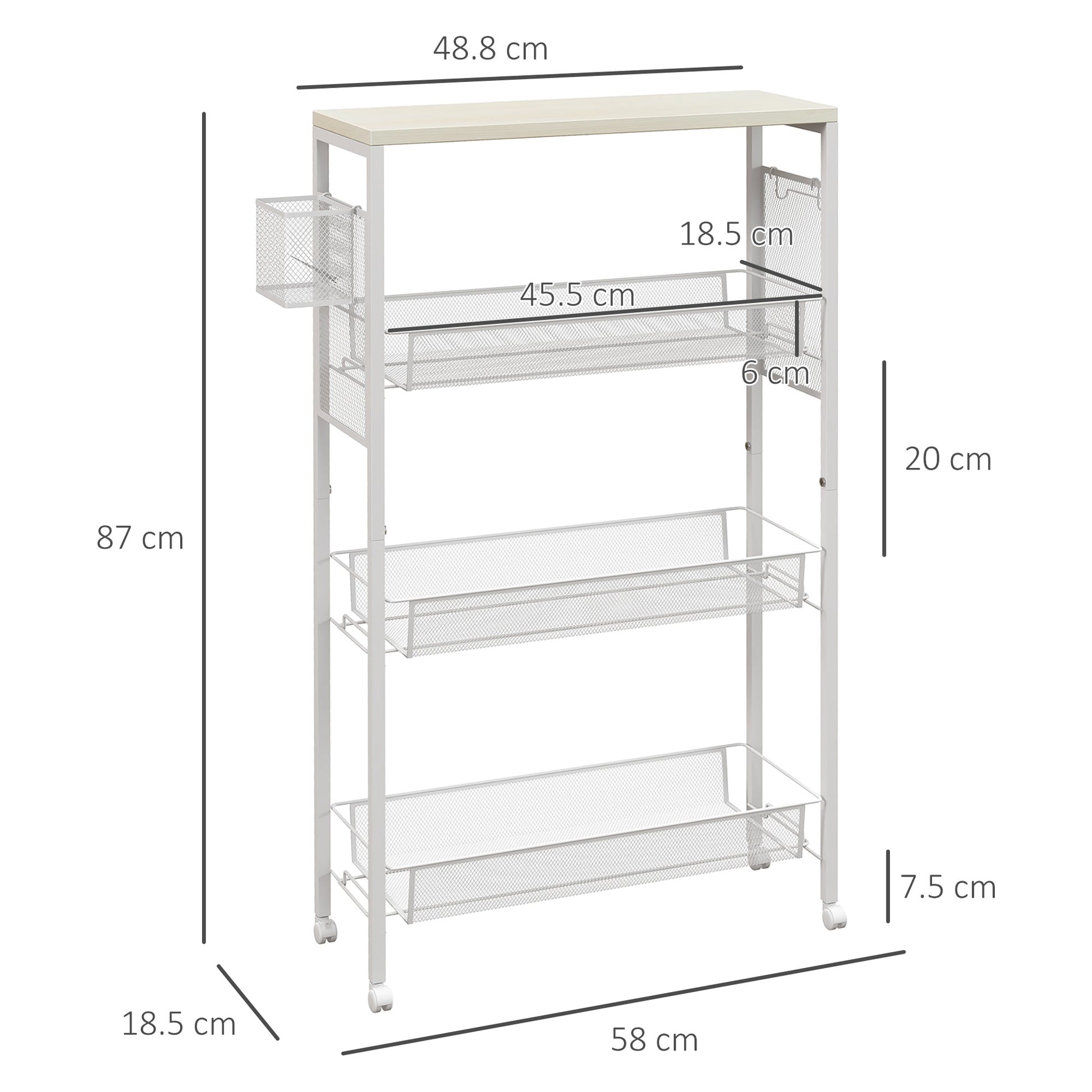 - Weight Capacity: 11 kg (total), 2.5 kg (top/storage basket), 0.5 kg (hanging basket/hook)